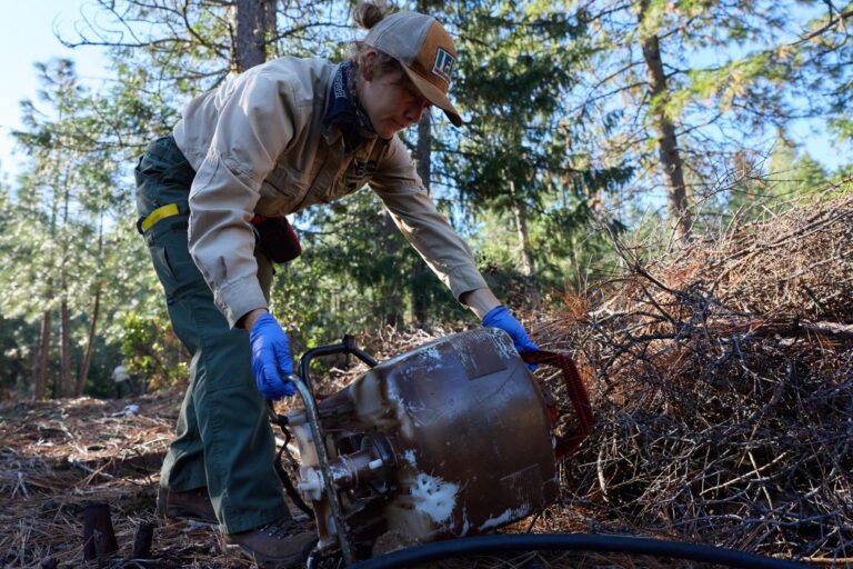 A member of the Integral Ecology Research Center discovers a pesticide sprayer hidden under bushes at an illegal cannabis site in the Shasta-Trinity National Forest on November 12, 2025. Photos by Fred Greaves for CalMatters Illegal cannabis farms hidden in…