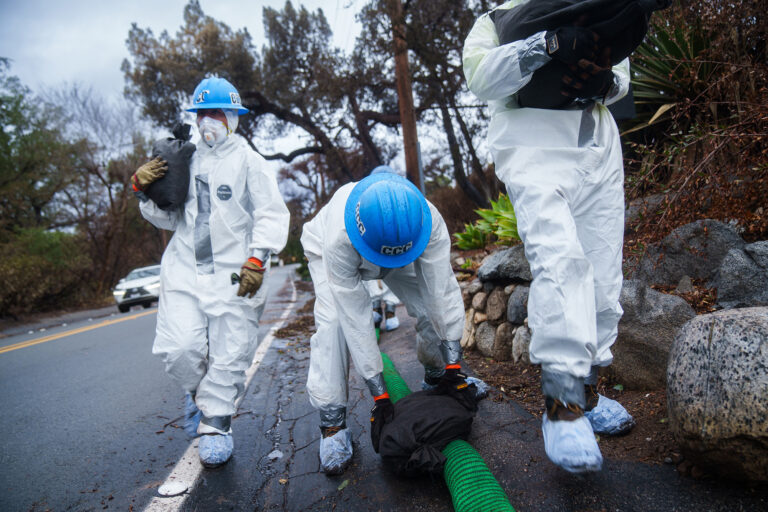 By Lauren Levitic, special for Calmatters Workers with the California Conservation Corps carry sand and compost filtering bags while working on various efforts to control erosion, floods and debris before the estimated rain in the Altadena neighborhood in Los Angeles,…