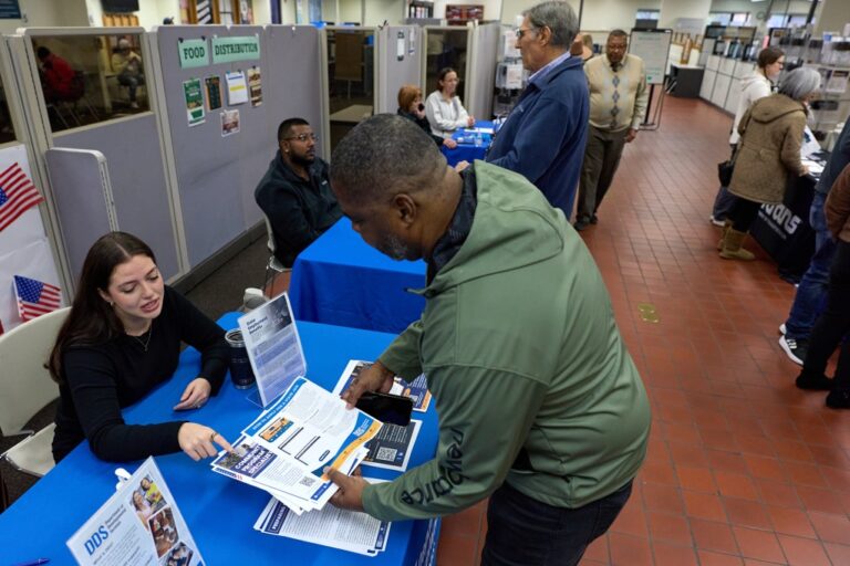 A California Department of Development Services employee (left) talks with a job seeker at a job fair at the Mark Sanders AJCC in Sacramento on Dec. 1, 2025. Photo by Fred Greaves for CalMatters From CalMatters economics reporter Levi Sumagasai:…
