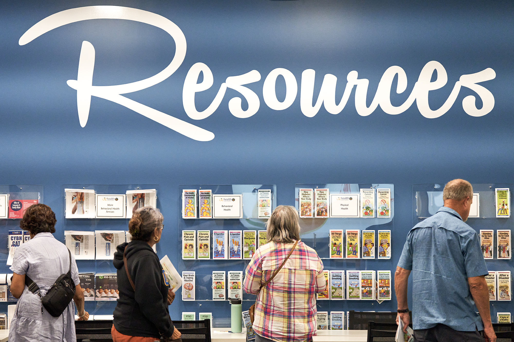 Community members pick up brochures about local resources after hearing a panel discuss CARE Court, a program launching in October 2023, at the Orange County Behavioral Health Learning Center on August 17, 2023. Photo by Lauren Justice for CalMatters