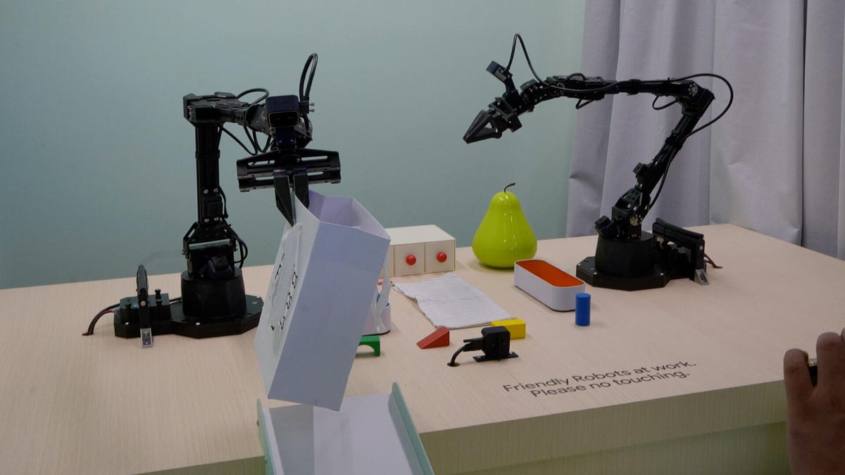 GEMINI AI of Google offers a pair of Aloha 2 Robot Arms while trying to distribute a gift bag.