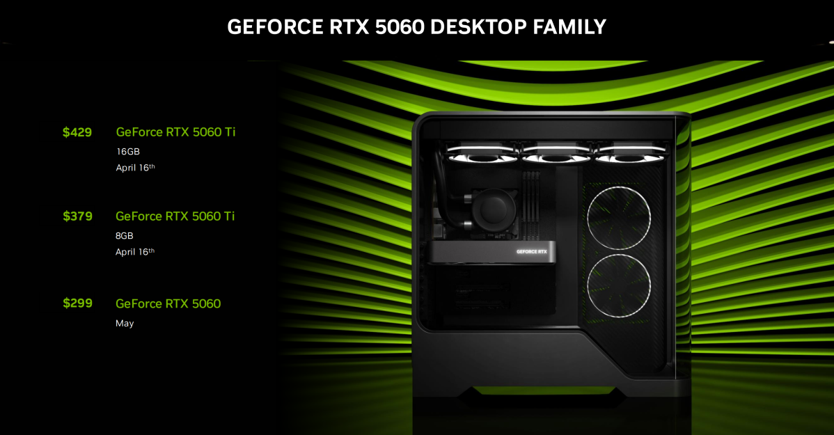 Nafidia Advertisement The RTX 5060 family of graphics processing units today, just one day before the RTX 5060 TI version on April 16. Two types of RTX 5060 TI, 379 dollars are launched 379 dollars, and 429 GB of $ 429. $ 299 RTX 5060 will be launched at some point in May with 8 GB of VRAM.