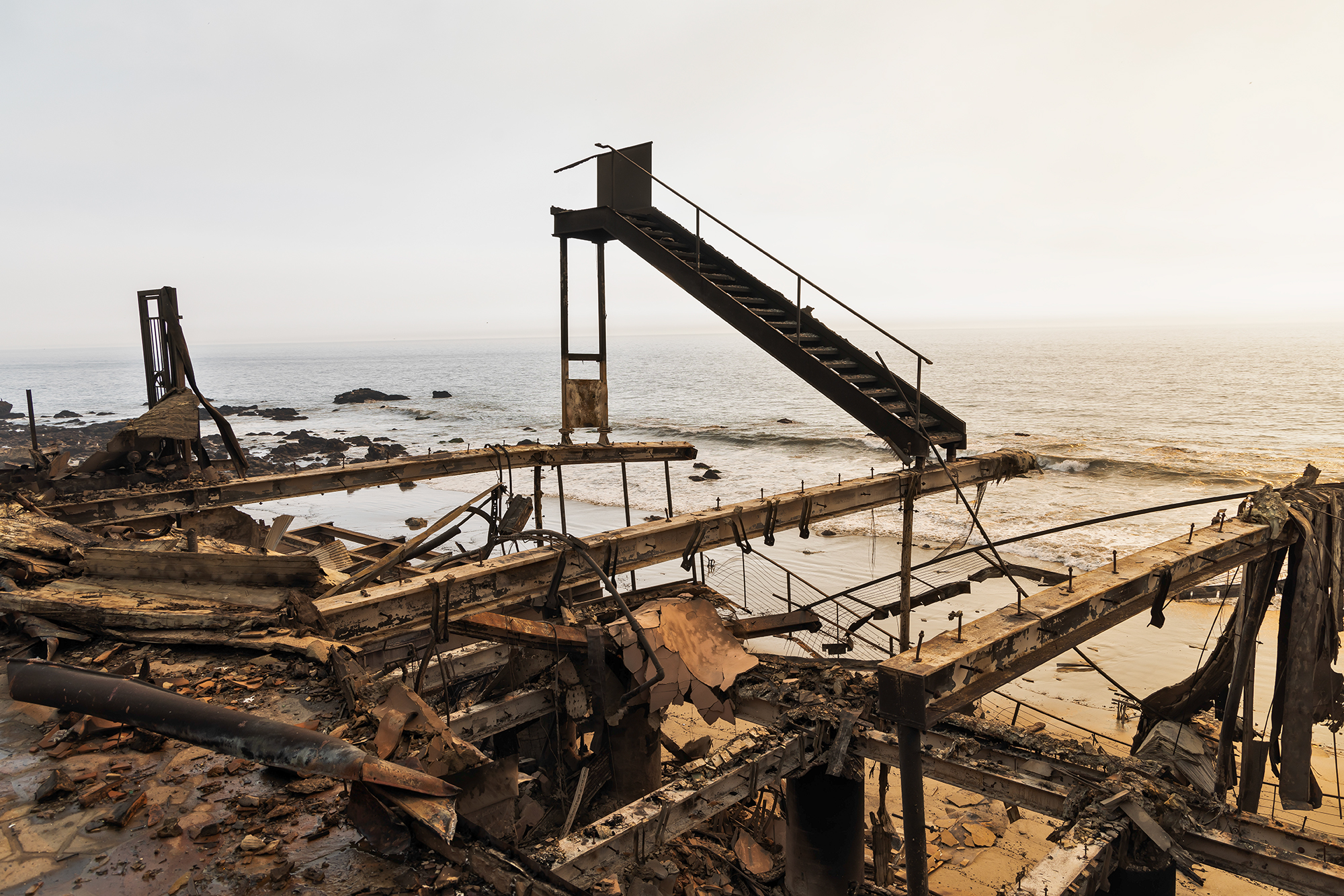 The wreckage of burned homes on Pacific Coast Highway near Malibu in the aftermath of the Palisades Fire. January 9, 2025 Photo by Ted Socki for CalMatters
