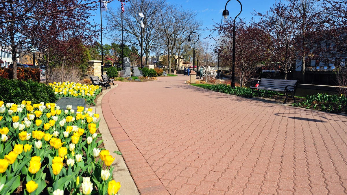 Tolpus lines part of Riverwalk along the Dupage River in Nabarefil, Illinois.